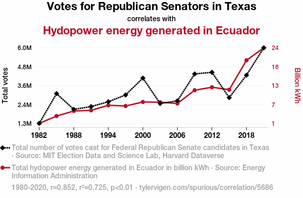 - The spurious research paper: Hydropower Votes: A Current of Correlation between Republican Votes for Texas Senators and Hydropower Energy Generated in Ecuador