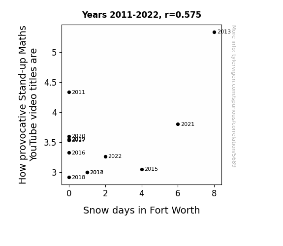 User prompt: Please make up a funny explanation for how a decrease in How provocative Stand-up Maths YouTube video titles are caused Snow days in Fort Worth to decrease.