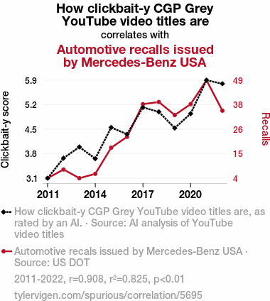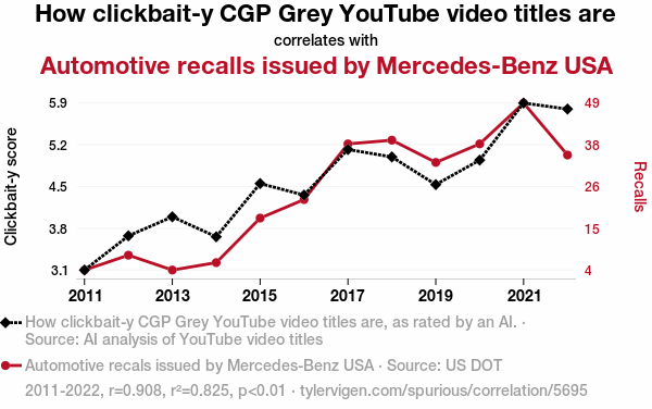 This means 82.5% of the change in the one variable (i.e., Automotive recalls issued by Mercedes-Benz USA) is predictable based on the change in the other (i.e., How clickbait-y CGP Grey YouTube video titles are) over the 12 years from 2011 through 2022.