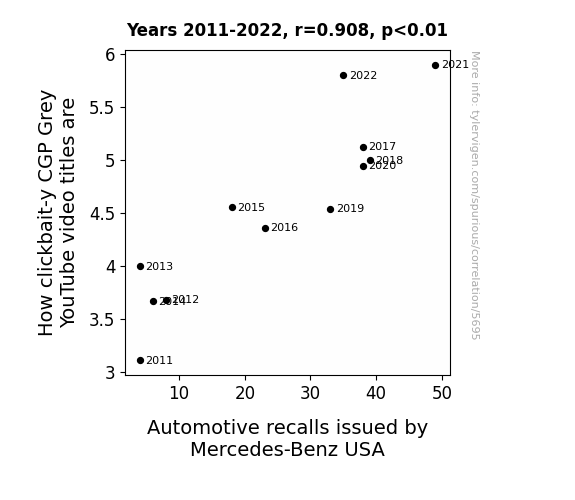 This paper explores the often-ignored relationship between the captivating clickbait-y titles of CGP Grey's YouTube videos and the issuance of automotive recalls by Mercedes-Benz USA. Through the use of advanced AI analysis of YouTube video titles and data gathered from the US Department of Transportation, our research team uncovered a statistically significant correlation coefficient of 0.9080681 (p < 0.01) for the period spanning 2011 to 2022. The findings of this study shed light on the intriguing connection between the art of crafting catchy titles and the rather unexciting world of automotive recalls. As we delve into this unforeseen correlation, we present a compendium of puns, jokes, and unexpected twists as we navigate through the intricacies of clickbait and automotive safety.