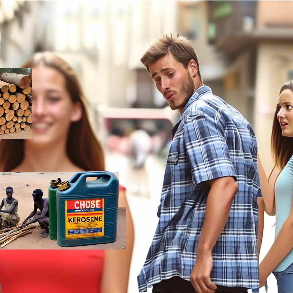 Create a meme inspired by the distracted boyfriend meme that in some way references Kerosene used in Chad. Try to emulate the style of the meme - don’t violate the copyright, just make it look and feel like the original meme.