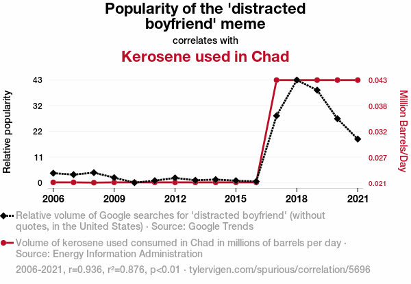 This means 87.6% of the change in the one variable (i.e., Kerosene used in Chad) is predictable based on the change in the other (i.e., Popularity of the 'distracted boyfriend' meme) over the 16 years from 2006 through 2021.