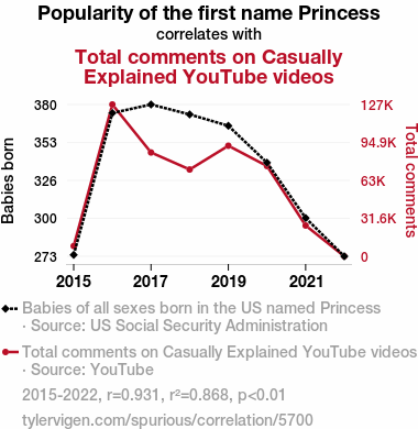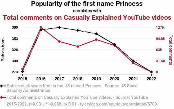 User prompt: Please provide potential search keywords for a paper titled The Princess Effect: A Royally Entertaining Investigation into the Popularity of the Name Princess and its Impact on Comment Counts on Casually Explained YouTube Videos with an abstract of In this paper, we present a comprehensive analysis of the relationship between the prevalence of the first name "Princess" and the total comments on videos from the popular YouTube channel, Casually Explained. Drawing on data from the US Social Security Administration and YouTube, our research team sought to uncover whether there exists a significant correlation between the adoption of the royal moniker and engagement with humorous educational content. Our findings reveal a remarkably high correlation coefficient of 0.9314306 and a significance level of p < 0.01 for the period spanning from 2015 to 2022.