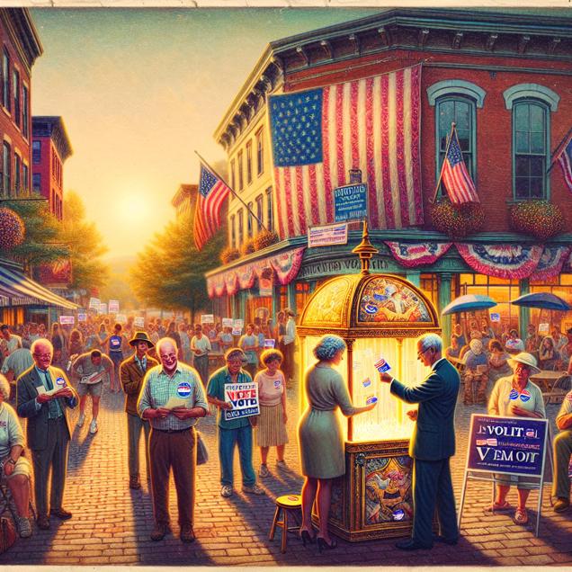 Prompt: Generate an image of a bustling town square in Vermont, captured in a Polaroid photo. In the center of the square, a large banner displays the name "Pearl" in elegant, shimmering letters that catch the sunlight. People gather around, each holding a voting slip in hand, ready to cast their votes. The atmosphere is filled with excitement as individuals eagerly drop their ballots into a giant, sparkling treasure chest, symbolizing the electoral options. Among the crowd, a group of supporters proudly hold signs for the Libertarian Presidential candidate, their enthusiasm reflected in the glimmer of their iridescent stickers. The scene is a delightful fusion of the irresistible allure of the name Pearl and the fervor for the Libertarian candidate, creating a pearlytical party at the polls. The depiction should include only scenes, people, and objects, it should not include text or speech bubbles.