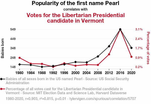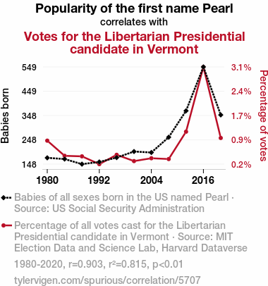 "Pearl name popularity, Libertarian vote Vermont, US Social Security Administration data, MIT Election Data and Science Lab, Harvard Dataverse, correlation coefficient, political preferences, social dynamics, electoral analysis"