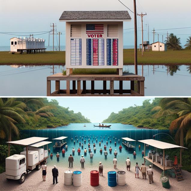 ChatGPT: In Nebraska, a voting booth displays a decreasing count of votes for Democratic senators, while a blue wave energy plant in the background shows reduced power output. Meanwhile, in Belize, people are shown using less kerosene as they switch to alternative fuel sources, symbolized by a dwindling pile of unused kerosene containers.
