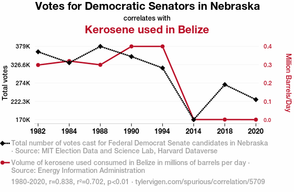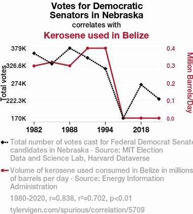 - The spurious research paper: From Cornfields to Kerosene: Uncovering the Quirky Connection Between Nebraska Senatorial Democratic Votes and Belizean Kerosene Usage
