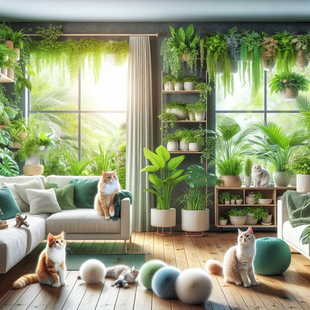 Prompt: Generate an image of a cozy living room with abundant greenery and indoor plants. Cats are nestled among the foliage, playfully pawing at fluffy cat toys or looking out of the window at the thriving plant life. The room exudes a tranquil atmosphere, with the clean air and vibrant greenery creating a peaceful and inviting space for both humans and their feline friends. The depiction should include only scenes, people, and objects, it should not include text or speech bubbles.