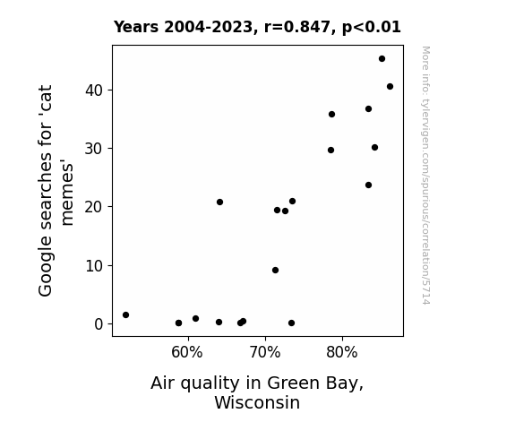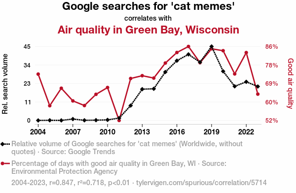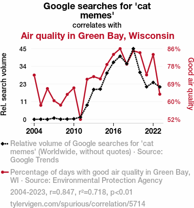 - The spurious research paper: Pawsitively Purrfect: An Intriguing Correlation Between Google Searches for 'Cat Memes' and Air Quality in Green Bay, Wisconsin