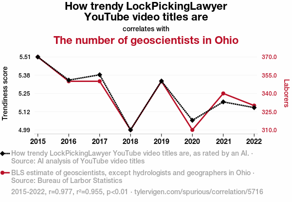 This means 95.5% of the change in the one variable (i.e., The number of geoscientists in Ohio) is predictable based on the change in the other (i.e., How trendy LockPickingLawyer YouTube video titles are) over the 8 years from 2015 through 2022.