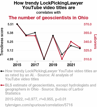 User prompt: Please make up a funny explanation for how a decrease in How trendy LockPickingLawyer YouTube video titles are caused The number of geoscientists in Ohio to decrease. Make it feel plausible.