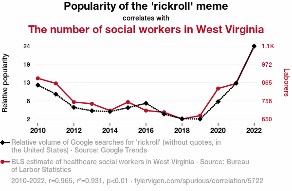 'rickroll' meme, social workers, West Virginia, correlation, Google Trends, Bureau of Labor Statistics, internet culture, labor markets, infectious nature, meme impact, local employment, data analysis