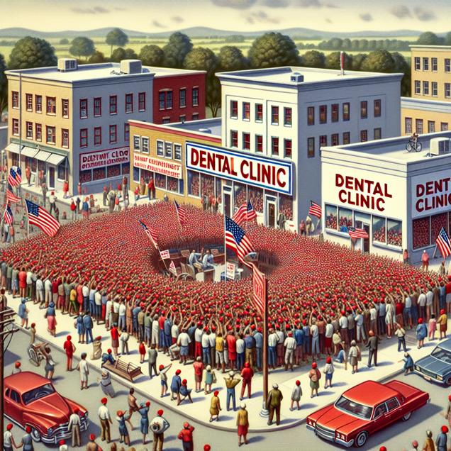 ChatGPT: Generate an image of a realistic bustling town square in Indiana featuring a large rally for Republican senators. The scene should include a sea of red hats and flags waving as the crowd cheers. A dental clinic across the street should be visible, with its waiting room filled with people eager to see the newly hired dentists. The image should reflect the undeniable correlation between the political rally and the increased number of dentists in Indiana. The visual should capture the fervent support for conservative values and the thriving activity in the dental clinic, portraying the bustling energy of the town square and the excitement stimulated by the political shift.