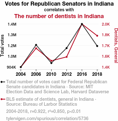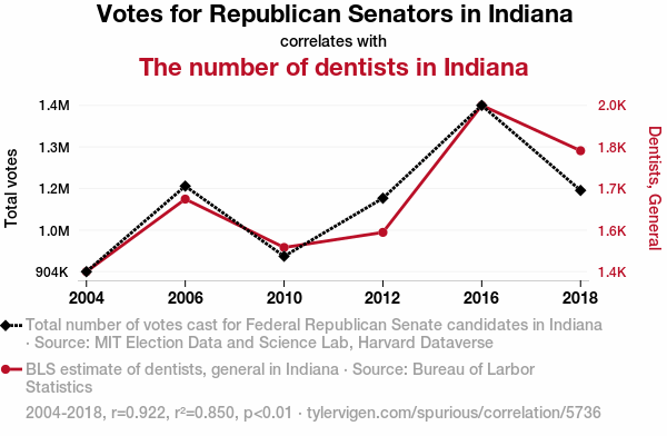 - The spurious research paper: Grinning and Voting: An Analysis of the Correlation Between Republican Senatorial Votes and the Density of Dentists in Indiana