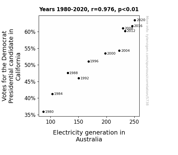 This means 95.2% of the change in the one variable (i.e., Electricity generation in Australia) is predictable based on the change in the other (i.e., Votes for the Democratic Presidential candidate in California) over the 11 years from 1980 through 2020.