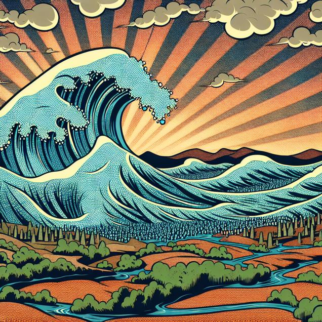 Prompt: Generate a comic-book-style illustration with muted colors and a dotted halftone pattern from the 1960s depicting a wave of blue votes surging across California. The wave generates a burst of electricity that crackles and illuminates the skies over the vast Australian Outback. The illustration should be rich in texture, with bold outlines and shading, and convey a sense of movement and energy. The depiction should include only scenes, people, and objects, it should not include text or speech bubbles.