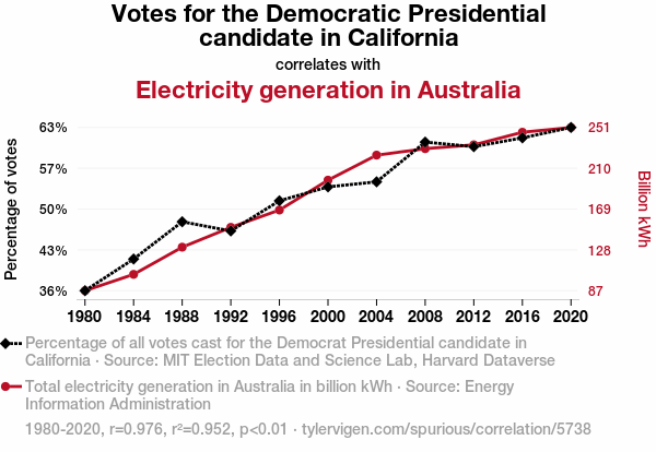 This means 95.2% of the change in the one variable (i.e., Electricity generation in Australia) is predictable based on the change in the other (i.e., Votes for the Democratic Presidential candidate in California) over the 11 years from 1980 through 2020.