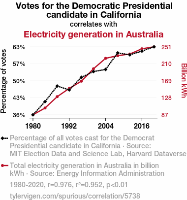 California Democratic votes, Australia electricity generation, correlation analysis, MIT Election Data and Science Lab, Harvard Dataverse, Energy Information Administration, correlation coefficient, p-value, 1980-2020, political data analysis, energy data analysis