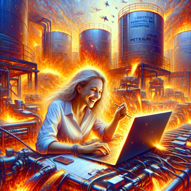 ChatGPT: Generate an image based on the scene of inventor Simone Giertz sitting amidst tanks of LPG in Samoa. As she gleefully types on her laptop, sparks fly from the keyboard, igniting the air with a burst of energy. The surroundings shimmer with heat, and the video titles she's creating are filled with provocative puns and explosive ideas. The composition should highlight the contrast between Simone's playful inventiveness and the powerful energy she's surrounded by.