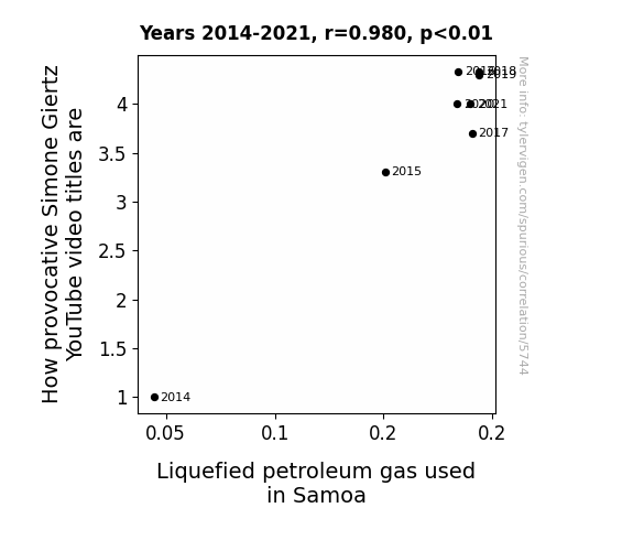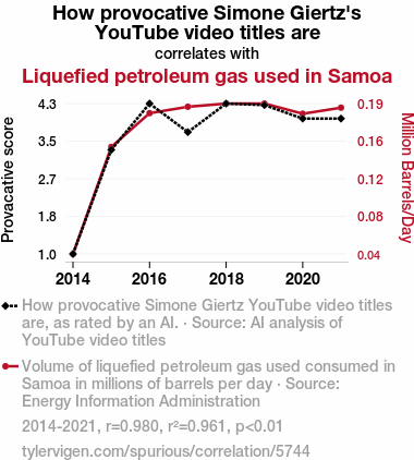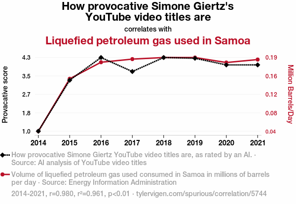 This means 96.1% of the change in the one variable (i.e., Liquefied petroleum gas used in Samoa) is predictable based on the change in the other (i.e., How provocative Simone Giertz's YouTube video titles are) over the 8 years from 2014 through 2021.