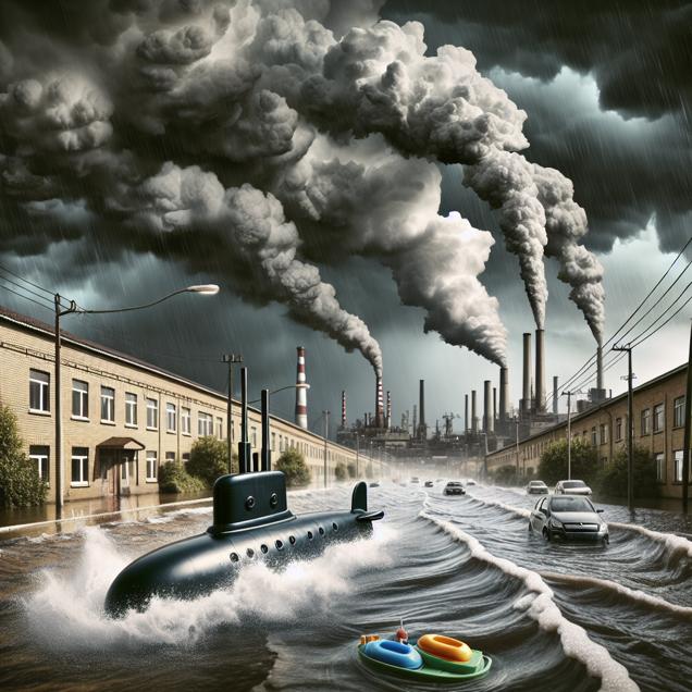 ChatGPT: [Suddenly, an intense storm brews above Johnstown, Pennsylvania. The sky darkens as powerful winds whip across the landscape, and a torrential downpour ensues. Amidst the chaos, towering smokestacks of the toy boat and miniature submarine factories release billows of noxious black smoke, adding to the already polluted atmosphere. In the foreground, a miniature plastic submarine bobs in a rain-filled puddle, highlighting the tragic irony of a nautical-themed toy juxtaposed against the environmental damage caused by its production.]