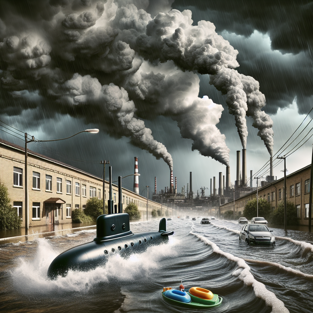 Prompt: [Suddenly, an intense storm brews above Johnstown, Pennsylvania. The sky darkens as powerful winds whip across the landscape, and a torrential downpour ensues. Amidst the chaos, towering smokestacks of the toy boat and miniature submarine factories release billows of noxious black smoke, adding to the already polluted atmosphere. In the foreground, a miniature plastic submarine bobs in a rain-filled puddle, highlighting the tragic irony of a nautical-themed toy juxtaposed against the environmental damage caused by its production.] The depiction should include only scenes, people, and objects, it should not include text or speech bubbles.