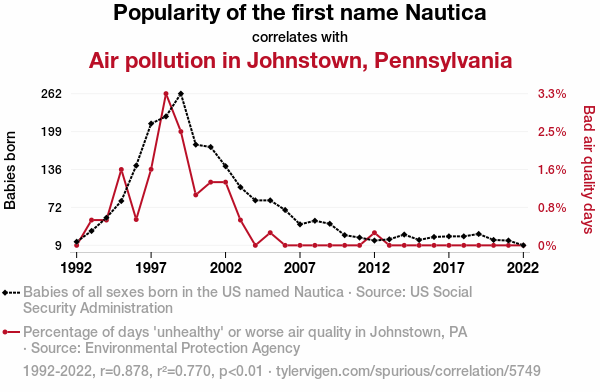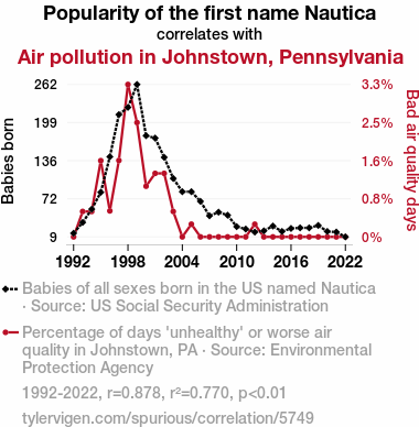 This means 77% of the change in the one variable (i.e., Air pollution in Johnstown, Pennsylvania) is predictable based on the change in the other (i.e., Popularity of the first name Nautica) over the 31 years from 1992 through 2022.