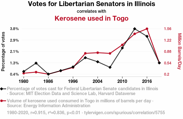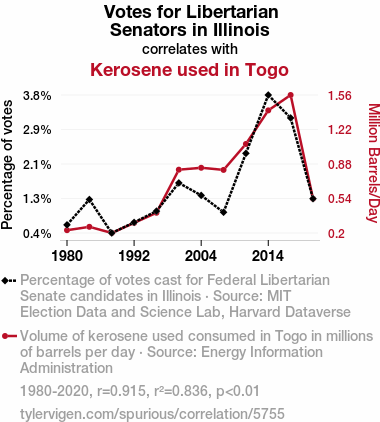 - The spurious research paper: From Libertarian Leanings to Luminous Light: A Correlation Analysis of Senatorial Votes in Illinois and Kerosene Consumption in Togo