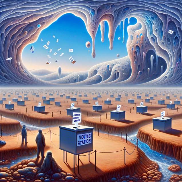 Prompt: Prompt: In the realm of surrealism, visualize a scene where amidst the vast expanse of the Nevada desert, a polling station emerges, surrounded by swirling hot air laced with carbon dioxide. Libertarian ballots surge into the ballot box, as the landscape quivers with the intensity of political debates. Meanwhile, in Greenland, towering icebergs show ominous signs of melting, revealing hidden reserves of gasoline gushing forth to surprise onlookers. The depiction should include only scenes, people, and objects, it should not include text or speech bubbles.