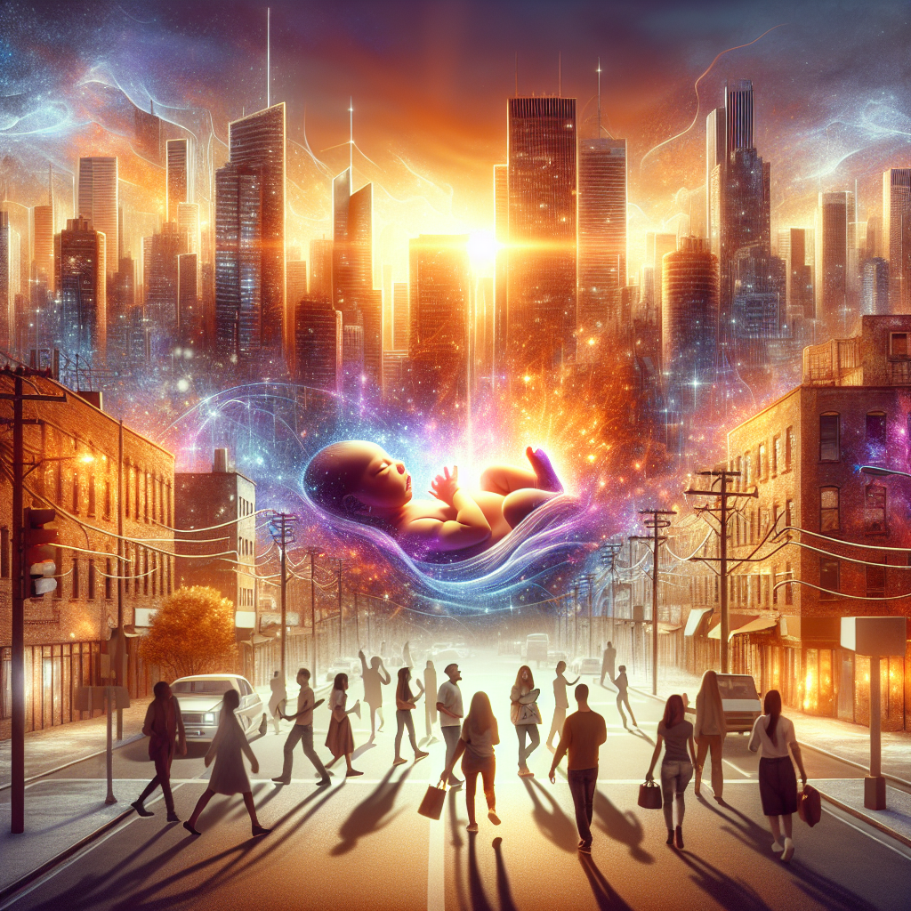 User prompt: Please respond with an image generation prompt that would be likely to create an interesting visual using DALLE-3, using the following style: [ A Discovery magazine cover image ] and depicting this scene: Picture a bustling city street where every baby born with the name Chandler is surrounded by a shimmering aura of creativity. As each Chandler comes into the world, the LEMMiNO YouTube videos grow longer and more captivating. The sun sets on the horizon, casting a warm glow over the city as the universe is filled with an electric buzz of inspiration and a sense of wonder. Keep the visual depiction simple. Do not include any words or speech bubbles.