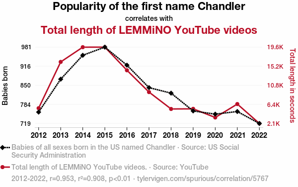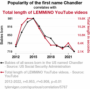 User prompt: Please provide potential search keywords for a paper titled Chillin' with Chandler or Channeling Data: The Correlation Between the Popularity of the Name Chandler and the Length of LEMMiNO YouTube Videos with an abstract of In this paper, we delve into the peculiar connection between the popularity of the name Chandler and the total length of LEMMiNO YouTube videos. Utilizing data obtained from the US Social Security Administration and YouTube, we embarked on an empirical investigation to explore this seemingly whimsical correlation. Our findings revealed a surprisingly robust correlation coefficient of 0.9530278 and a statistically significant p-value of less than 0.01, indicating a strong association between the two variables from 2012 to 2022. Our analysis not only provides insight into this intriguing relationship but also offers a glimpse into the unforeseen entanglements of nomenclature and digital content creation.
