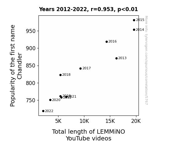 Our investigation ruminates on the unanticipated cohesion between these seemingly unrelated variables. By tapping into data from the US Social Security Administration to track the prevalence of the name Chandler and scrutinizing the repertoire of LEMMiNO's videos, we seek to shed light on this unforeseen nexus. The aim is not merely to establish a statistical relationship but to unravel the latent dynamics that underlie the interplay between nomenclature and digital content production.