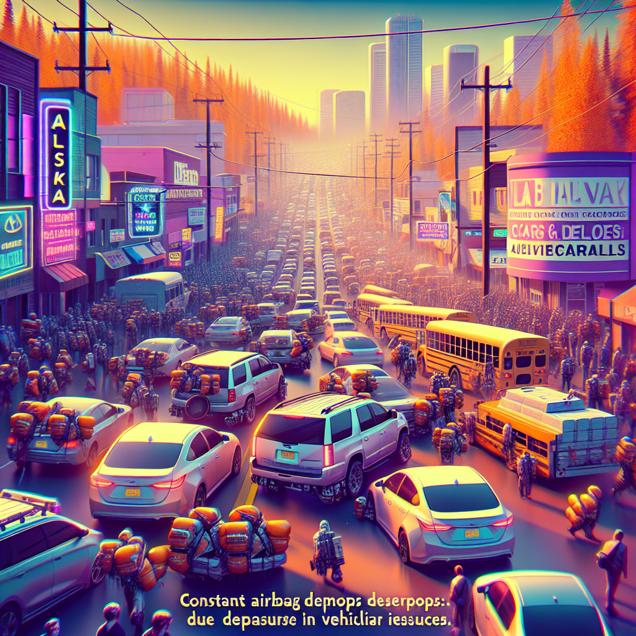 ChatGPT: In a bustling Alaskan town, a stream of cars fills the streets as people head to the polls to vote for the Libertarian Presidential candidate. The airbags in the cars are activated frequently as the vehicles navigate the busy roads, causing strain on the systems. At the same time, a growing number of vehicles are being recalled due to airbag issues, reflecting the increased demand on car usage driven by the surge in support for the Libertarian candidate.