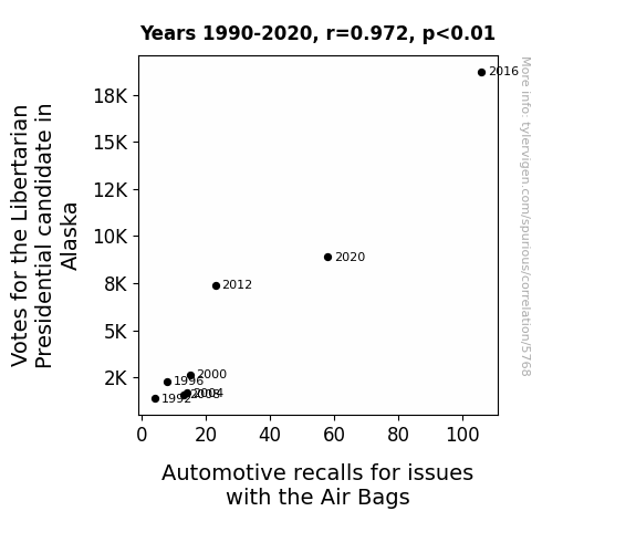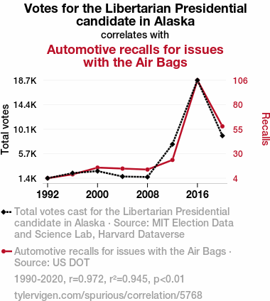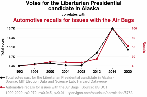 User prompt: Please provide potential search keywords for a paper titled Air Bags and Ballots: A Study of Libertarian Votes in Alaska and Automotive Recalls with an abstract of This research paper investigates the fascinating correlation between votes for the Libertarian presidential candidate in Alaska and automotive recalls for issues with air bags. Utilizing data from the MIT Election Data and Science Lab, Harvard Dataverse, and the US Department of Transportation, we uncovered a substantial correlation coefficient of 0.9719805 and p < 0.01 for the period from 1990 to 2020. It's as if the air bags were trying to inflate the candidate's vote count!