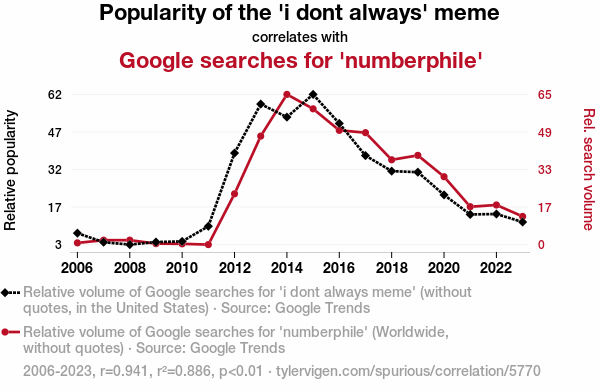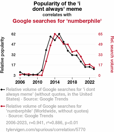 - The spurious research paper: I Don't Always Research Internet Memes, but When I Do, I Google 'Numberphile': The Correlation Between the Popularity of the 'i don't always' Meme and Google Searches for 'Numberphile'