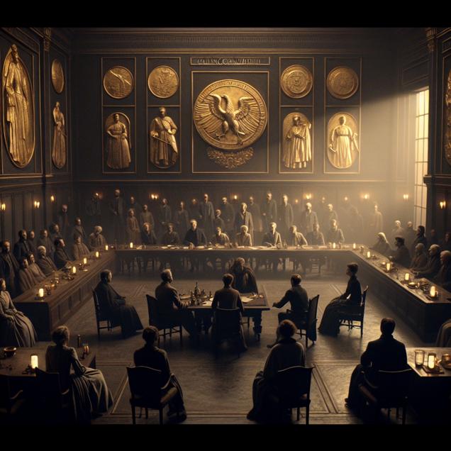 ChatGPT: [ Cutsy graphics ] Generate an image of a dimly lit council chamber with grand golden plaques covered in dust. Show council members sitting in a somber circle, expressing a sense of disheartenment and faded influence. In the background, depict a room with a whiteboard surrounded by a team of people scratching their heads in confusion, conveying a lack of inspiration and ongoing struggle to find captivating historical content.