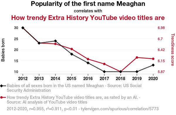 User prompt: Please provide potential search keywords for a paper titled Meaghan-Popularity Reign and Extra History Video Title Trend Terrain with an abstract of This research explores the intriguing and quirky relationship between the popularity of the first name Meaghan and the trendy landscape of Extra History YouTube video titles. Drawing upon data from the US Social Security Administration for the prevalence of the name Meaghan and AI analysis of Extra History video titles, we uncovered a correlation coefficient of 0.9545137, with a statistically significant p-value of less than 0.01 for the years 2012 to 2020. Our study delves into the beguiling world of naming patterns and online video culture, showcasing the surprising link between the two. The implications of our findings may alter the perception of what it means to be "trendy" and open up new avenues for interdisciplinary research, all while making a few puns along the way.