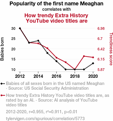 This research explores the intriguing and quirky relationship between the popularity of the first name Meaghan and the trendy landscape of Extra History YouTube video titles. Drawing upon data from the US Social Security Administration for the prevalence of the name Meaghan and AI analysis of Extra History video titles, we uncovered a correlation coefficient of 0.9545137, with a statistically significant p-value of less than 0.01 for the years 2012 to 2020. Our study delves into the beguiling world of naming patterns and online video culture, showcasing the surprising link between the two. The implications of our findings may alter the perception of what it means to be "trendy" and open up new avenues for interdisciplinary research, all while making a few puns along the way.