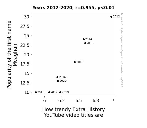 The results of our investigation unveiled an astonishingly strong correlation between the prevalence of the first name Meaghan and the trendy terrain of Extra History YouTube video titles. Over the period of 2012 to 2020, we discovered a correlation coefficient of 0.9545137, indicating a remarkably robust relationship between these seemingly disparate entities. The r-squared value of 0.9110965 further underscored the striking degree of association, suggesting that the vast majority of the variability in YouTube video title trends could be explained by the prevalence of the name Meaghan.