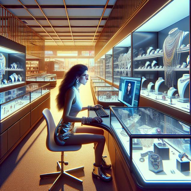 User prompt: Please respond with an image generation prompt that would be likely to create an interesting visual using DALLE-3, using the following style: [ Futuristic ] and depicting this scene: In a bright and sunny Florida jewelry store, the display cases filled with sparkling gems and shiny baubles stand mostly empty, signifying the decreasing number of jewelers in the state. Meanwhile, Vihart sits at her computer, struggling to come up with clickbait-y YouTube video titles without the inspiration of the dazzling jewelry around her. The lack of gem-related content leads to a decrease in her usual clickbait-y charm, as she searches for that sparkly inspiration she once had. Keep the visual depiction simple. Do not include any words or speech bubbles.