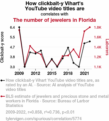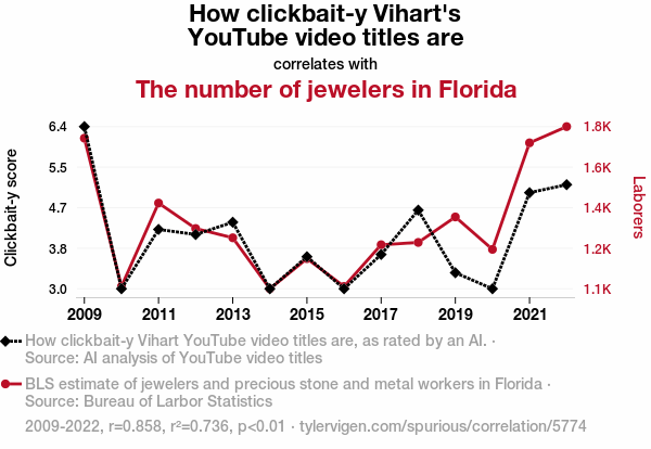 User prompt: Please provide potential search keywords for a paper titled Click-baiting for Diamonds: A Sparkling Investigation into the Relationship Between Vihart Video Titles and the Number of Jewelers in Florida with an abstract of This paper presents a holistic examination of the enthralling link between the clickbait nature of Vihart YouTube video titles and the number of jewelers in the Sunshine State. Utilizing cutting-edge AI analysis of YouTube video titles and data from the Bureau of Labor Statistics, we have rigorously scrutinized this seemingly peculiar connection. Our study, spanning from 2009 to 2022, has yielded a noteworthy correlation coefficient of 0.8581676 and a statistically significant p-value of less than 0.01, suggesting a compelling relationship that cannot be dismissed as mere happenstance.