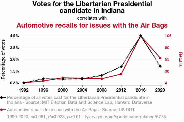 User prompt: Please provide potential search keywords for a paper titled Voting Libertarian: A Burst of Air Bag Recalls in the Hoosier State with an abstract of This paper investigates the intriguing relationship between votes for the Libertarian presidential candidate in Indiana and automotive recalls for issues with the airbags. Leveraging data from the MIT Election Data and Science Lab, Harvard Dataverse, and US DOT, we delve into this unlikely pairing to understand its depth and breadth. Our findings reveal a striking correlation coefficient of 0.9607240 and p < 0.01 for the period from 1990 to 2020, indicating a robust and statistically significant connection between these two seemingly disparate phenomena.