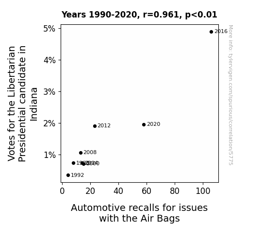 This paper investigates the intriguing relationship between votes for the Libertarian presidential candidate in Indiana and automotive recalls for issues with the airbags. Leveraging data from the MIT Election Data and Science Lab, Harvard Dataverse, and US DOT, we delve into this unlikely pairing to understand its depth and breadth. Our findings reveal a striking correlation coefficient of 0.9607240 and p < 0.01 for the period from 1990 to 2020, indicating a robust and statistically significant connection between these two seemingly disparate phenomena.