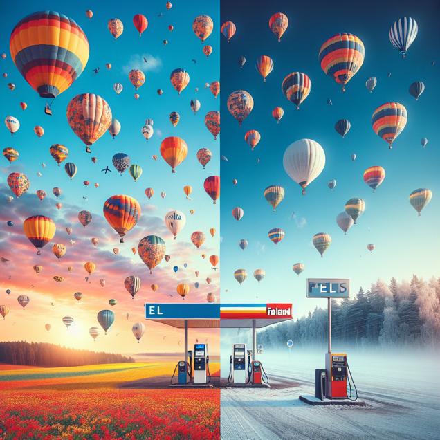 Prompt: Image Generation Prompt: Generate an image that depicts a scene where hot air balloons are floating in the sky above Maryland, USA, with some of them gradually losing height and cooling down. Meanwhile, in Finland, portray a few petrol pumps standing idle, with the surrounding area feeling cooler. The image should evoke a sense of political and environmental change affecting the atmosphere and the demand for petroleum products. The depiction should include only scenes, people, and objects, it should not include text or speech bubbles.
