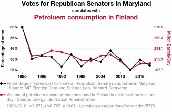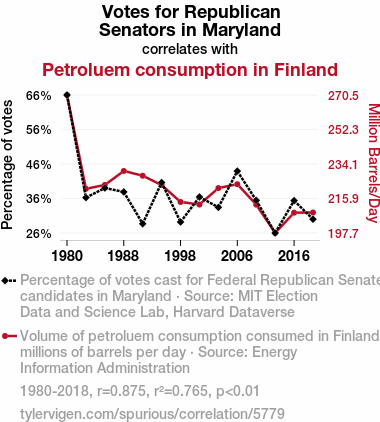 A linear line chart with years as the X-axis and two variables on the Y-axis. The first variable is Votes for Republican Senators in Maryland and the second variable is Petroluem consumption in Finland.  The chart goes from 1980 to 2018, and the two variables track closely in value over that time. Small Image
