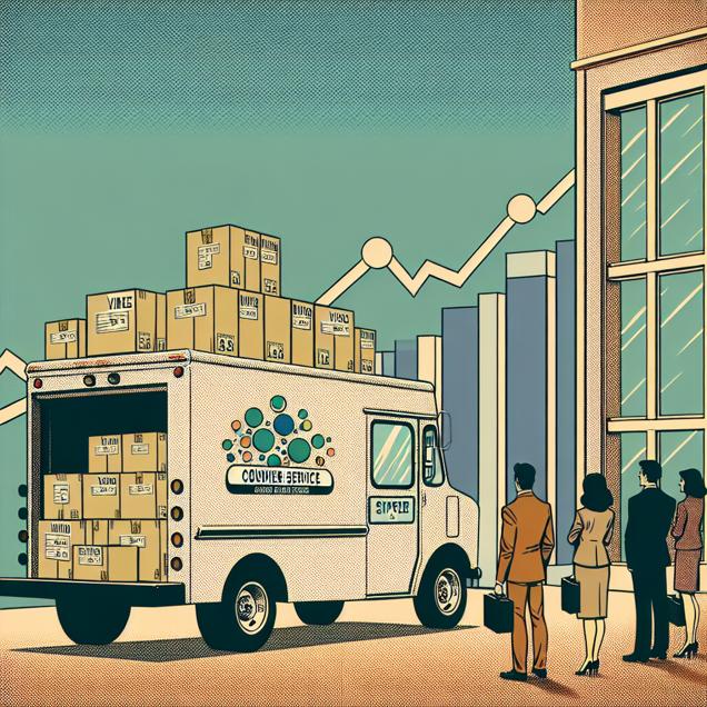 ChatGPT: Generate a comic-book-style illustration with muted colors and a dotted halftone pattern from the 1960s. Depict a scene where a FedEx delivery truck pulls up outside AsapSCIENCE's office. The truck's doors are swung open, revealing a stack of packages filled with provocative video ideas. As the packages are unloaded, the titles of the videos are visible on their side, catching the eyes of passing investors. In the background, the stock price chart of FedEx (FDX) shows a steady ascent, symbolizing the increased interest and investment in the company. Keep the visual depiction simple. Do not include any words or speech bubbles.