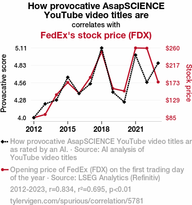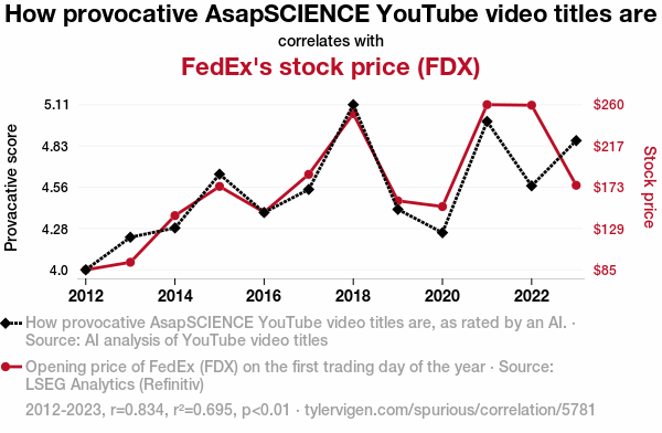 This means 69.5% of the change in the one variable (i.e., FedEx's stock price (FDX)) is predictable based on the change in the other (i.e., How provocative AsapSCIENCE YouTube video titles are) over the 12 years from 2012 through 2023.