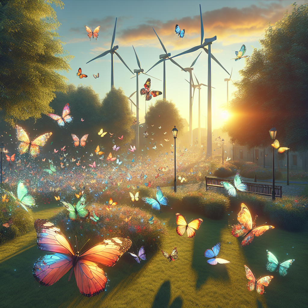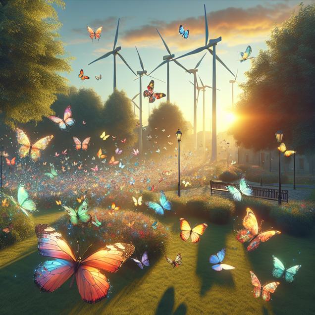 Prompt: Description: A serene park in Warsaw, Indiana serves as the setting for this scene. Colorful butterflies gracefully flutter through the clean air, their delicate wings creating a mesmerizing dance. As they take flight, their gentle movements seem to ripple through the atmosphere, reaching all the way to Latvia. There, the once calm breeze transforms into powerful gusts, churning the wind turbines and producing an abundance of renewable energy. The connection between the thriving butterfly population and the increased wind power generation forms a whimsical and beautiful link between the two distant locations. Image Generation Prompt: Generate a serene, whimsical image of colorful butterflies gracefully fluttering through a serene park in Warsaw, Indiana. Their delicate wings create a mesmerizing dance as they take flight. Visualize a scene depicting the connection between the thriving butterfly population and the increased wind power generation in Latvia, as the gentle movements of the butterflies seem to ripple through the atmosphere, transforming calm breezes into powerful gusts that churn the wind turbines, producing renewable energy. The image should capture the whimsical and beautiful link between the two distant locations. The depiction should include only scenes, people, and objects, it should not include text or speech bubbles.