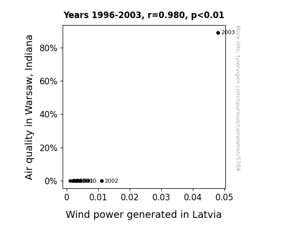 This means 96.1% of the change in the one variable (i.e., Wind power generated in Latvia) is predictable based on the change in the other (i.e., Air quality in Warsaw, Indiana) over the 8 years from 1996 through 2003.