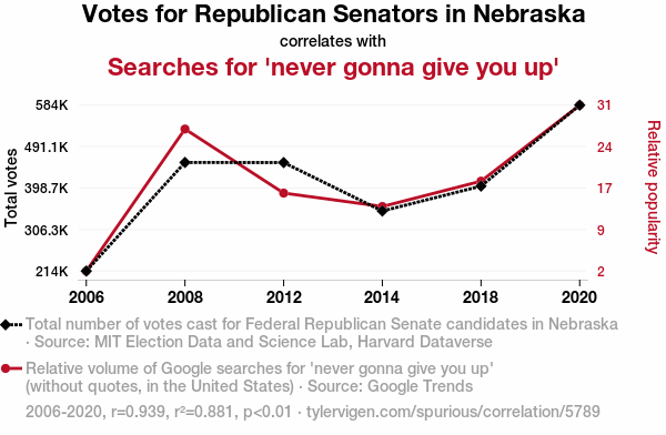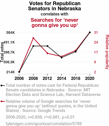 Fig. 1: A scatterplot depicting the strong correlation between Republican votes for Senators in Nebraska and the popularity of the 'never gonna give you up' meme. You can almost hear the faint echoes of "Never Gonna Give You Up" in the background.